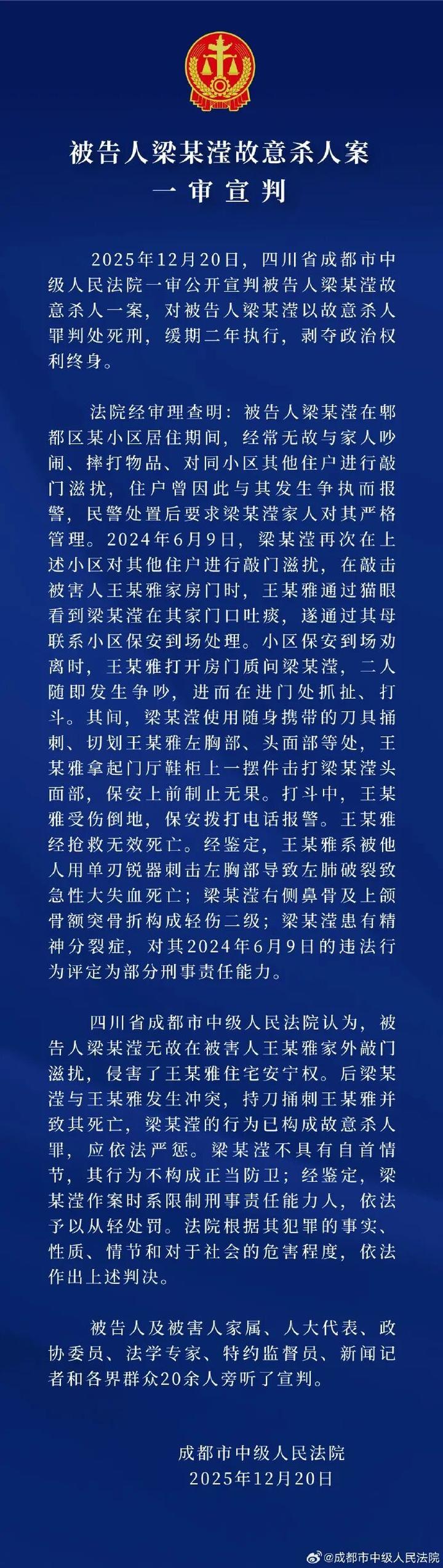 12月20日,据四川省成都市中级人民法院官方微博消息,被告人梁某滢故意杀人案一审宣判。