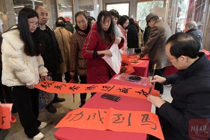 1月31日,在成都市双流区永安镇三新村永安造物场首届“村糖会”上,当地居民排队领取春联。