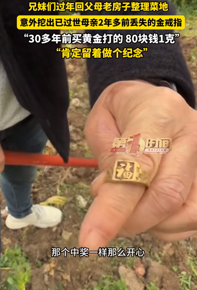 近日,四川内江兄妹们过年回父母老房子整理菜地,意外挖出已过世母亲2年多前丢失的金戒指。