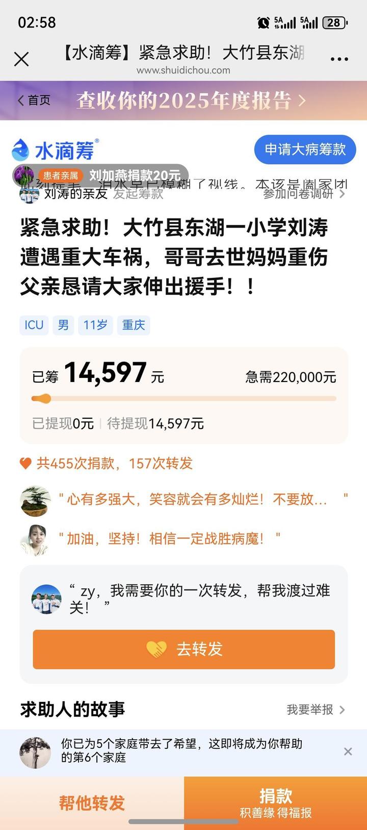 王杰介绍,昨日刚将大儿子下葬,目前,刘某某在万源住院,小儿子在达州住院,母子俩需要高额医疗费用,目前已花费10余万元。
