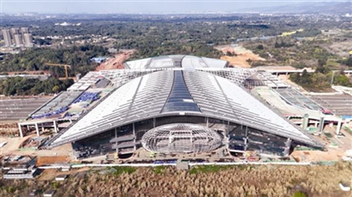 近日,成都铁路枢纽核心工程天府站建设现场迎来施工热潮,项目已全面复工复产,近200名建设者奋战一线,全力推进外部玻璃幕墙安装与站内装饰装修工程。这座以“筑巢引凤”为设计理念的交通枢纽站,融入凤凰羽、熊猫、竹节等天府文化元素,预计2026年建成,目前正朝着既定节点全力冲刺。