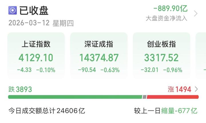 3月12日,A股三大指数集体走低。截至收盘,沪指跌0.10%,收报4129.10点;深证成指跌0.63%,收报14374.87点;创业板指跌0.96%,收报3317.52点。全市场成交额2.46万亿元,较昨日缩量677亿元。