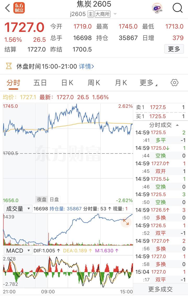 此外,今日期货市场中,焦煤、焦炭、螺纹钢等“黑色系”核心品种集体“支棱起来”。焦炭主连报1727.0元/吨,单日上涨1.56%,日内最高冲到1745.0元/吨;螺纹钢主力合约也摆脱前几日的萎靡不振,呈现企稳回升态势。