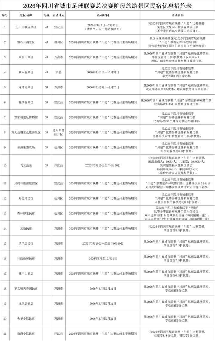 总决赛揭幕赛将在达州市体育中心打响。达州各大景区和精品民宿也拿出了诚意——门票打折、免票福利、住宿优惠通通安排上。其中,赛事期间,巴山大峡谷凭2026年川超比赛票根,免景区大象洞、桃溪谷景点门票(清明节、“五一”劳动节除外)。八台山景区、罗家坝遗址博物馆等推出在川超比赛达州主赛场期间免首道门票等优惠。达州众多民宿、餐饮联合推出“川超大礼包”,推出凭赛事门票享优惠折扣等福利。此外,还有川超特供米线福利,在川超达州主场比赛当天及后一天,凭观赛门票或球员证,在达州多家参与活动的餐饮店可以免费吃达县米线。