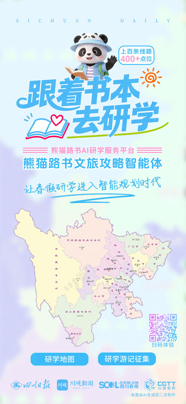 3月20日,由四川省教育厅与四川日报社联合推出的“跟着书本去研学·熊猫路书伴你行”AI研学服务平台,在川观新闻“熊猫路书”正式上线!这是在全国率先开发的首个集权威性、互动性和个性化服务于一体的AI研学服务平台。