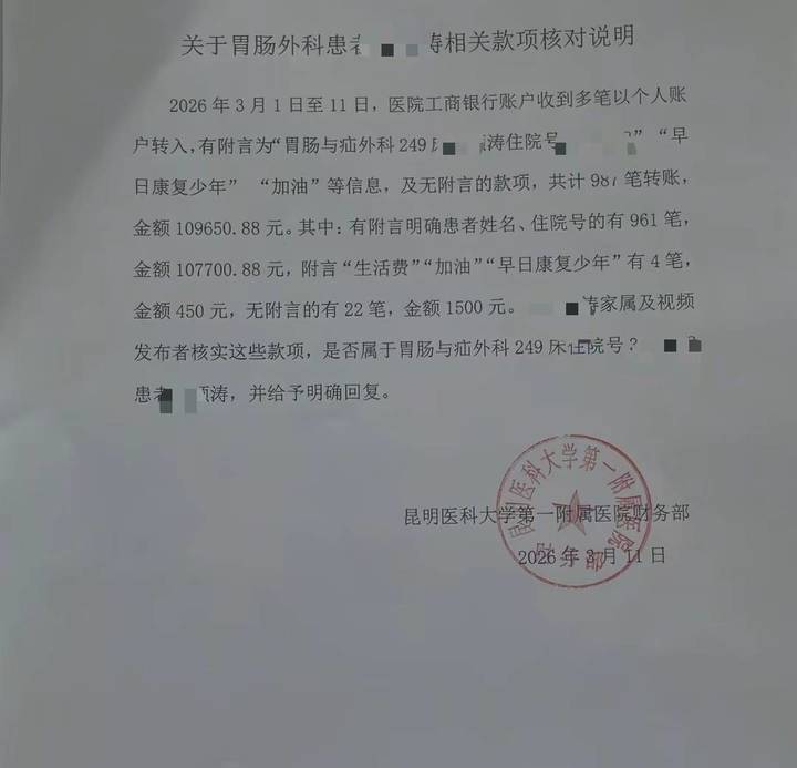 姚女士此前发布的款项核对说明和明细单显示,3月1日至11日,昆明医科大学第一附属医院银行账户收到多笔以个人账户转入,附言为“加油”“早日康复少年”等信息,及无附言的款项,共计987笔转账,金额109650.88元。其中大多数款项在3月1日、3月2日转入。姚女士表示,考虑到很多捐款人自身其实也很不容易,筹得十万元出头后,她便关闭了这一捐款渠道,“很多都是普通人,捐款数字有两块、五块、十块的”。