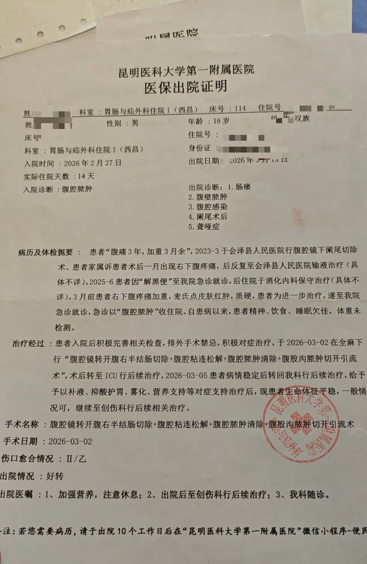 后来小涛又转至昆明医科大学第一附属医院呈贡院区创伤中心接受进一步治疗。出院证明显示,小涛在首次术后两天出现伤口感染,伴分泌物渗出。3月19日,他又在呈贡院区接受了“右侧腹股沟区皮肤和皮下坏死组织切除清创术+脓肿切开引流术+富血小板因子凝胶治疗术”,术后小涛一般情况平稳,右下腹近腹股沟区术口仍有血脓性液体渗出,于3月27日出院,并被建议至四川大学华西医院进一步诊治。