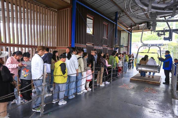 美心红酒小镇景区游客排队乘坐索道。