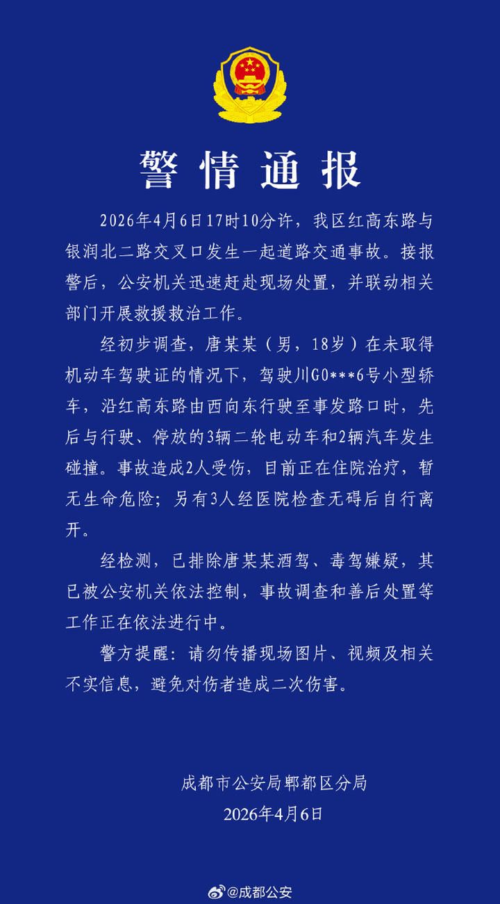 经初步调查,唐某某(男,18岁)在未取得机动车驾驶证的情况下,驾驶川G0***6号小型轿车,沿红高东路由西向东行驶至事发路口时,先后与行驶、停放的3辆二轮电动车和2辆汽车发生碰撞。事故造成2人受伤,目前正在住院治疗,暂无生命危险;另有3人经医院检查无碍后自行离开。