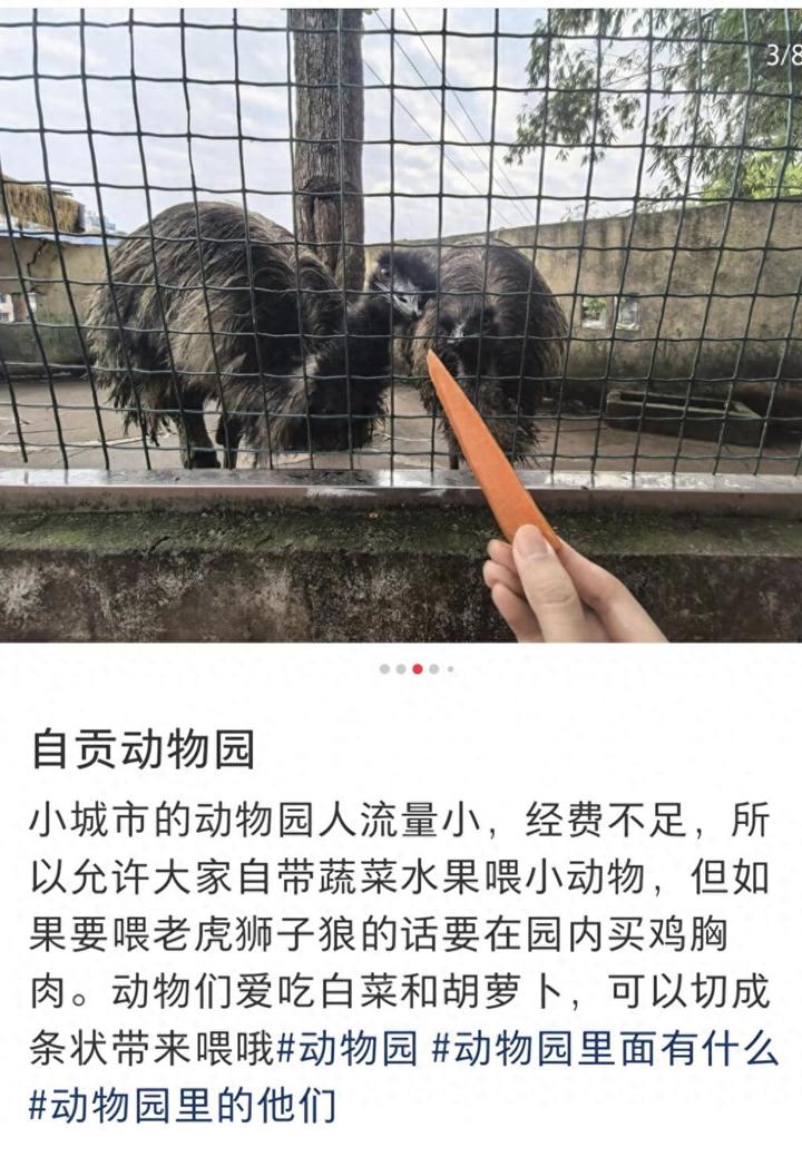 近日,一位网友在网络平台称,“位于四川省自贡市的自贡动物园,因人流量小,经费不足,所以允许大家自带蔬菜水果喂小动物。但如果要喂老虎、狮子、狼的话,要在园内买鸡胸肉。该网友还提醒,动物们爱吃白菜和胡萝卜,可以切成条状带来喂。”