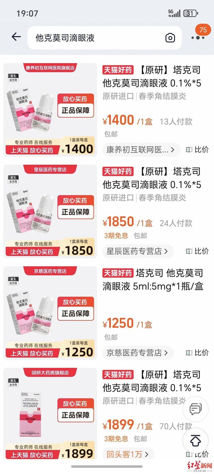 上述报道称,一位家长的孩子因角膜移植术后,需要长期使用他克莫司滴眼液,一旦停用这款滴眼液,移植的角膜植片就会坏死,孩子将面临失明风险。然而,最近一次复查开药时,该药在医院缺货,该家长需自行网购。该家长发现,原本700多一支的滴眼液,平台价格涨到了1700-3000多元不等,个别平台价格甚至翻了四倍。不少患者也在社交平台吐槽,该药因缺货大幅涨价。