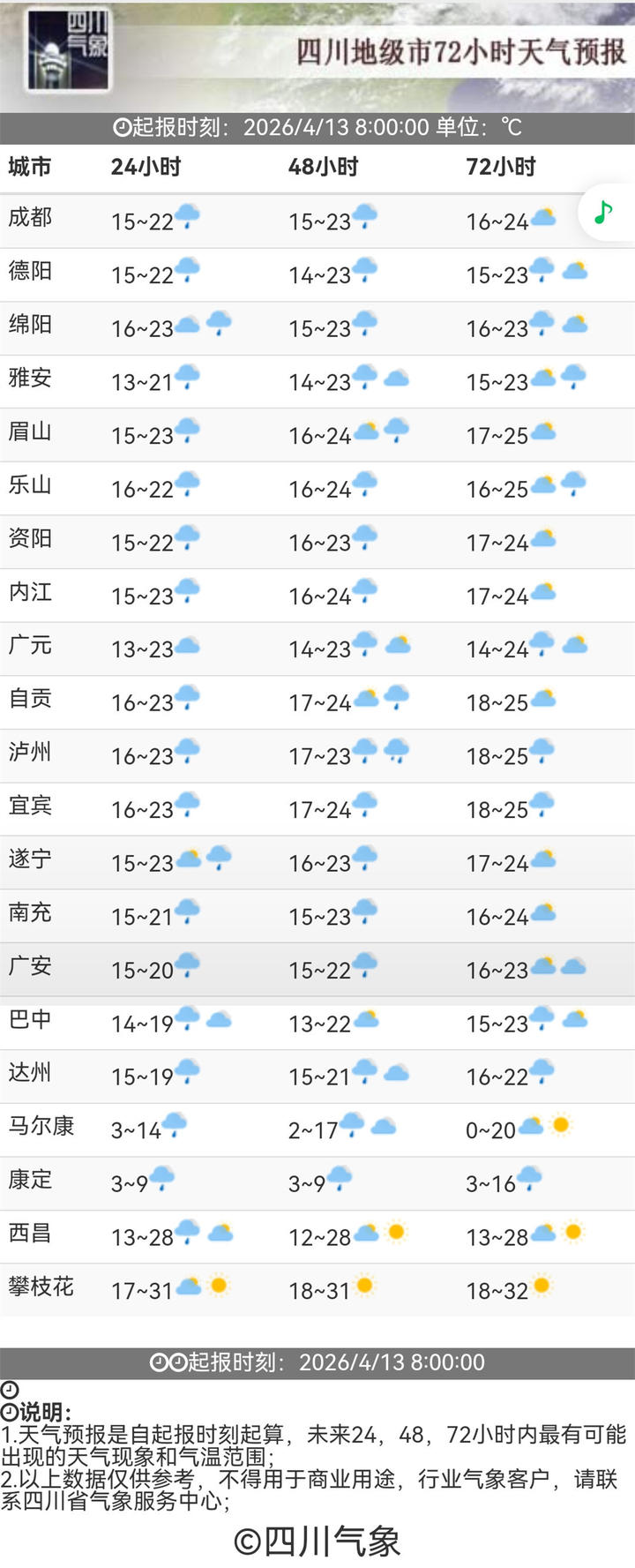14日白天到晚上,盆地大部阴天间多云有阵雨或雷雨,局地有中雨;川西高原大部和凉山州北部阴天间多云有阵雨(雪)或雷雨,局部地方有中雨或中雪,高海拔山区有大雪,攀西地区其余地方多云间晴。