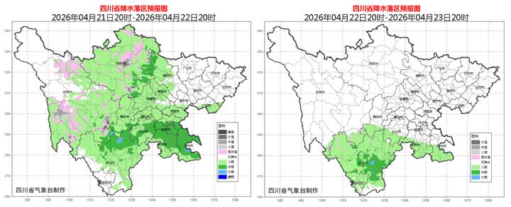 预计今天(4月20日)晚上,盆地大部阴天有阵雨,其中广元、巴中、达州、南充、广安、绵阳6市的部分地方有中雨,局地大雨;甘孜州北部东部、阿坝州和凉山州东北部多云间阴有分散阵雨(雪)或雷雨,局地有中雨或中雪。明天(4月21日)白天,盆地大部阴天有分散阵雨,川西高原大部和凉山州北部多云间阴有阵雨(雪)或雷雨。