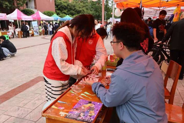 在互动游戏区与民俗体验区,“飞花令”“投壶雅趣”等传统游戏前人头攒动,参与者各展才情;神秘限定摊位上,“十二花神”现场对诗,集章兑换游戏体验券,妙趣横生。而社团展示区同样精彩纷呈,各社团自主设计摊位,开展互动小游戏。此外,活动还设置了多个蔷薇花限定浪漫打卡环节。“花神祈福树”前,师生们写下心愿挂于枝头;“春日信箱”中,一封封写给未来的信笺定格青春热爱;限定写真拍摄、压花书签DIY等环节,让每位参与者都能带走一份独属自己的春日记忆。