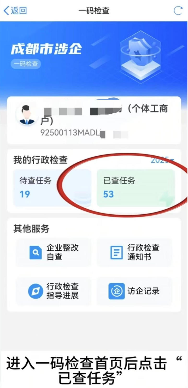 微信或支付宝搜索“天府通办”小程序、下载“天府通办”App,登录后搜索“一码检查”,选择“已查任务”,进入“我的行政检查”,查看市场监管部门已开展的检查任务记录。
