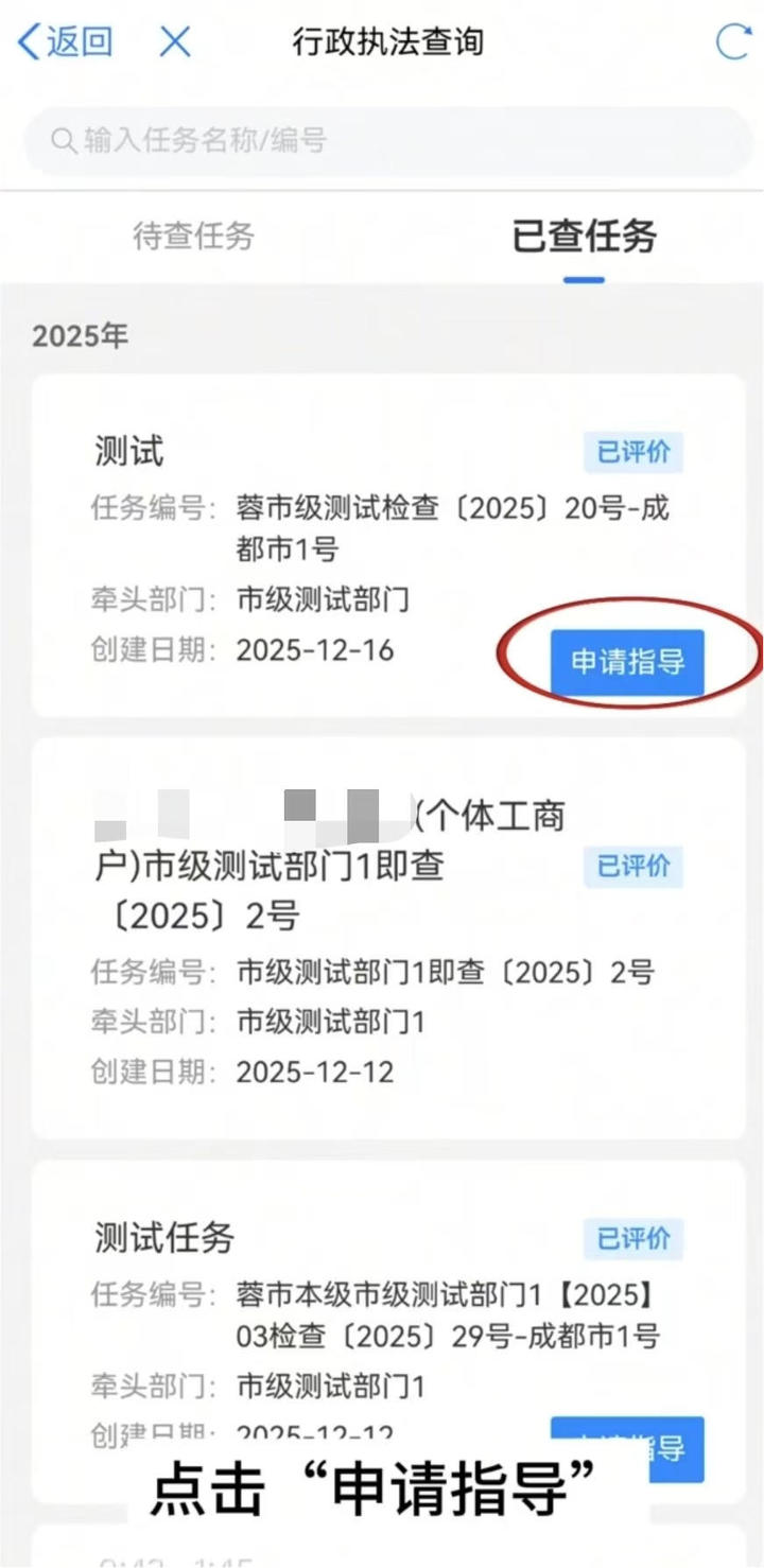 选择需申请指导的检查事项,点击“申请指导”,填写指导需求,期望上门的日期等,确认后提交。