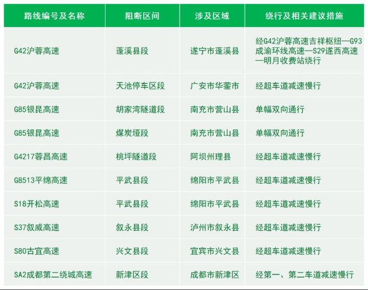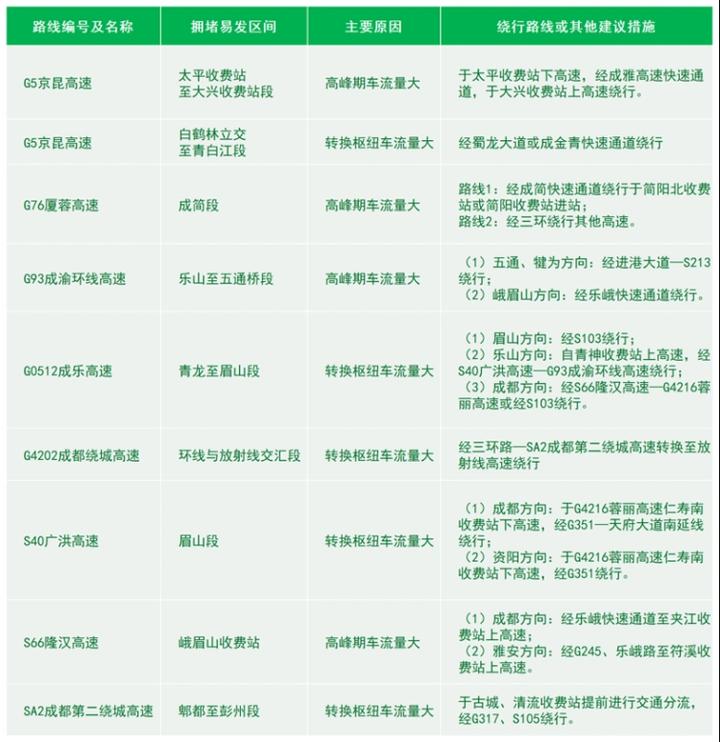值得注意的是,端午假期期间,G5京昆高速、G76厦蓉高速、G93成渝环线高速、G0512成乐高速、G4202成都绕城高速、S40广洪高速、S66隆汉高速、SA2成都第二绕城高速等高速公路易堵。同时,G42沪蓉高速蓬溪县段、G42沪蓉高速天池停车区段、G85银昆高速胡家湾隧道段、G85银昆高速煤炭垭段、G4217蓉昌高速桃坪隧道段、G8513平绵高速平武县段、S18开松高速平武县段、S37叙威高速叙永县段、S37叙威高速叙永县段、SA2成都第二绕城高速新津区段因施工或交通管制,建议绕行或减速慢行,注意行车安全。