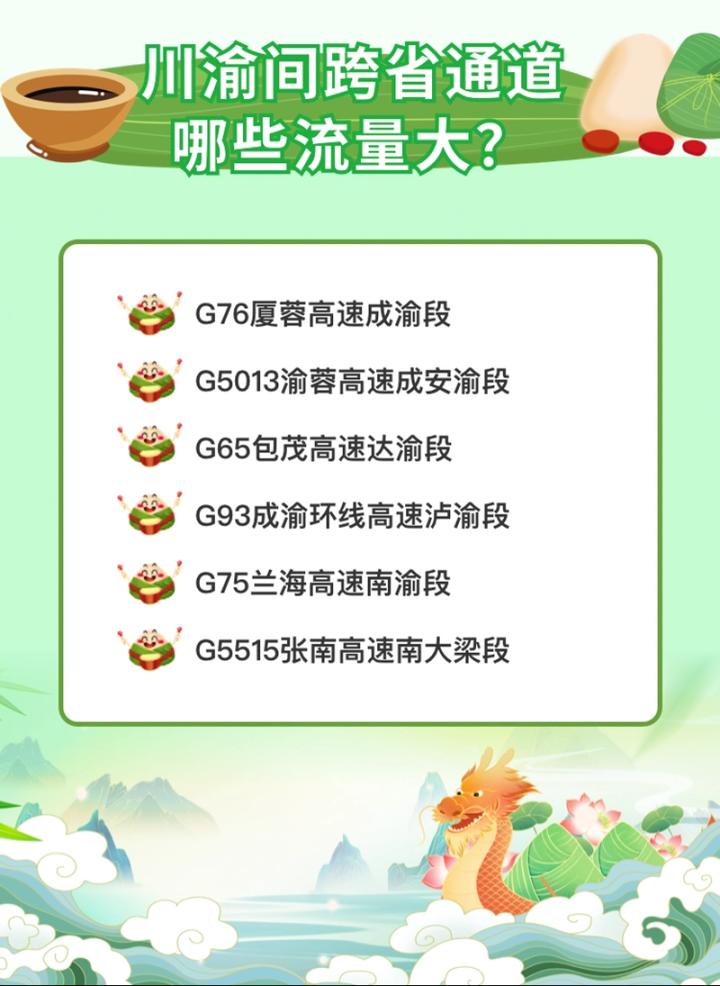 从总流量看,预计2025年端午假期全省高速公路网总流量958.0万辆次,日均约319.3万辆次,同比增长7.0%,较平时增长27.1%。跨省总流量约112.0万辆次,日均约37.3万辆次,同比增长9.1%。川渝方向流量最大,其次是川陕、川黔、川滇、川青、川甘方向。