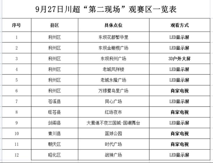 本次“第二现场”观赛活动旨在通过设置户外大屏、组织商家外摆电视等方式,让未购票的市民也能免费、便捷地共享赛事激情。主城区花都步行街、利州广场、金橄榄、凤祥楼、永隆广场等核心点位将利用显示屏进行比赛实况转播;鹭岛里、万达金街等重点街区也将组织商户开放外摆区域,利用电视等设备转播,方便消费者集中观赛。各县区同步设置观赛点位,实现全域覆盖。