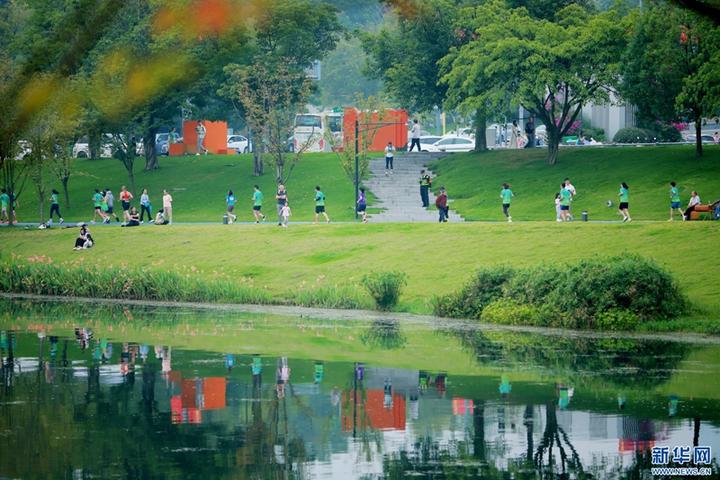 10月1日,参赛选手赛后在兴隆湖畔合影留念。