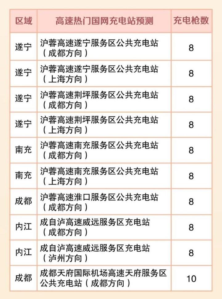 此外,预计以下四川省内高速国网充电站站点将较为繁忙,途经这些区域的车主请特别留意。