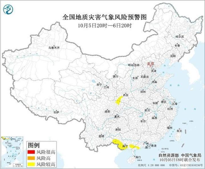 预计,10月5日20时至6日20时,广东西南部、广西西部和南部、四川东北部、云南东南部、陕西南部等地部分地区发生地质灾害的气象风险较高(黄色预警)。各级政府及有关部门按照应急预案做好地质灾害防御工作。请社会公众及时关注地质灾害气象风险预警信息,谨慎前往地质灾害预警区域。黄色预警区内人员,请随时关注预警信息变化,注意附近警示标志,避免在沟谷、斜坡、陡崖(坎)等高风险地带逗留。