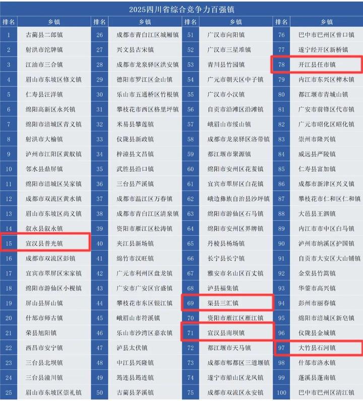 近日,竞争力智库、北京中新城市规划设计研究院等机构在北京联合发布《四川省乡镇综合竞争力报告2025》,揭晓“2025四川省综合竞争力百强镇”(简称“2025四川省百强镇”)名单。