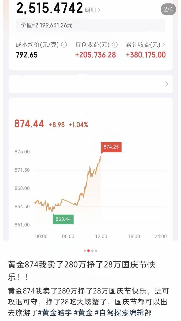 当金价开启暴涨模式,曾经执着于囤金的黄金爱好者,成了这个国庆最懂“快乐”的人:别人晒旅行风景,他们晒黄金收益,这份专属的节日喜悦格外有分量。