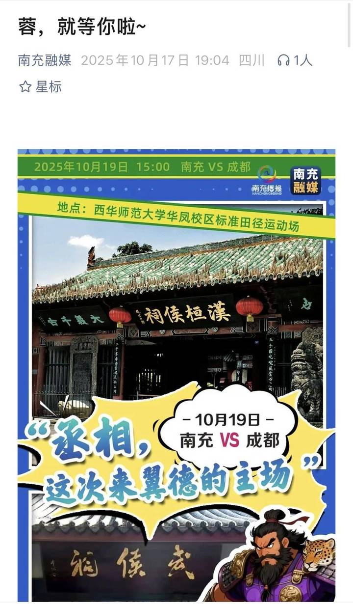 10月17日,南充也写信给成都,喊道:“蓉,就等你啦!”两地共同串联起三国文化的千年脉络,一张“丞相,这次来翼德的主场”的海报,画出了满满的“三国情怀”。诗圣杜甫也来牵线,从阆中古城到浣花溪畔,蜀地诗韵在两地回响。嘉陵江和锦江,更是一个壮阔一个浪漫。两支球队用足球续写着四川人“智信仁勇严”的精神密码,“这不是一场简单的比赛,而是一场跨越千年的对话,让三国的热血与足球的激情,在川蜀大地上共振回响”。
