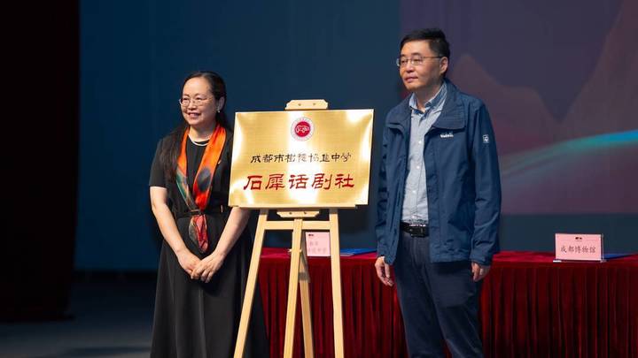成都市树德协进中学校长罗宇(左)与成都博物馆馆长任舸(右)为石犀话剧社揭牌