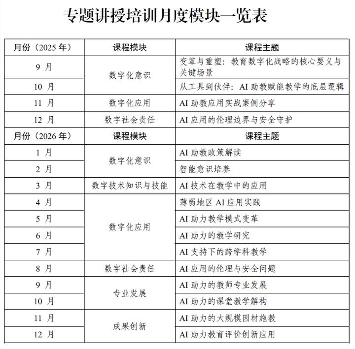 按照教育部实施数字化赋能教师发展行动的工作部署,教育厅制定了专门工作方案,规划了全员普及培训、专题讲授培训、关键少数培训等六类培训主题,其中全员普及、专题讲授培训通过在线方式实施,常态化培训到2026年底。