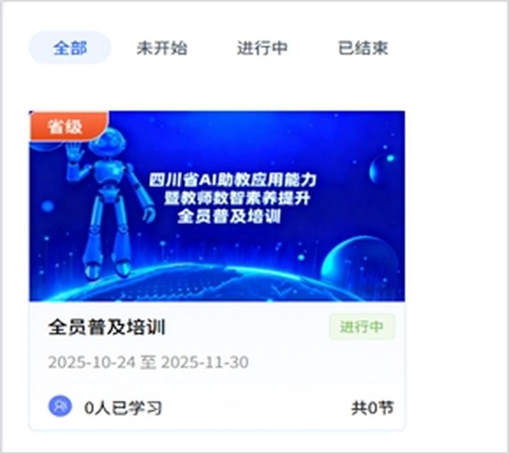 首先是全员普及培训。依托“四川智慧教育平台 ”(https://www.sc.smartedu.cn/)设立培训专区,提供系统化视频课程,共计32学时(必修20学时、选修12学时)。课程开放时间以平台公告为准。参训人员须按规定完成必修课程学习,鼓励结合需要自主选修课程。