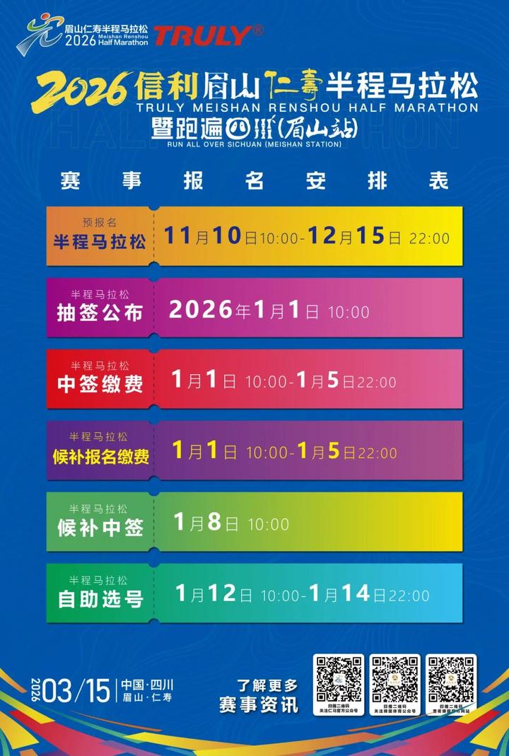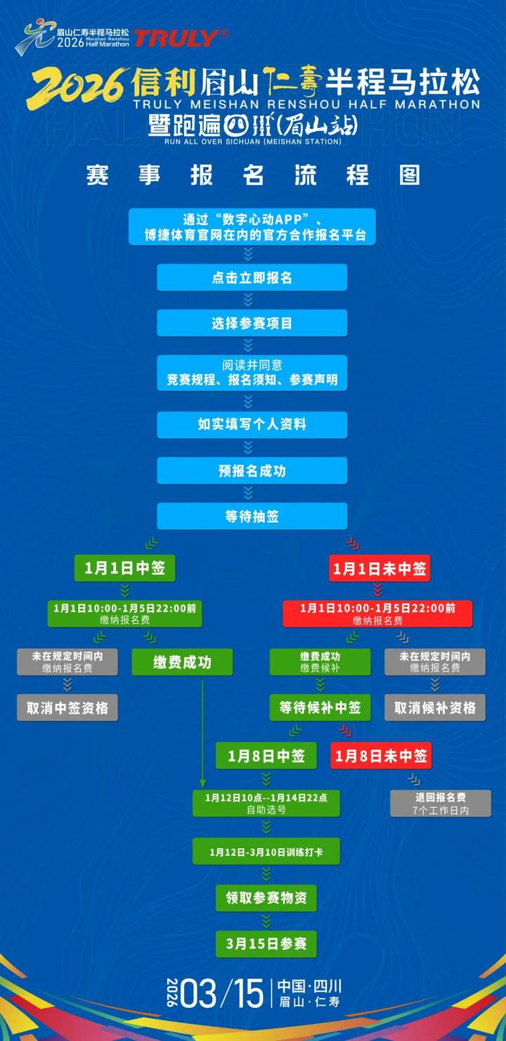 1.报名人数超出限报名额后,参赛资格获取将采取抽签的办法确认。中签选手需在规定时间内进行缴费确认参赛资格,如未按时缴费,视为主动放弃参赛资格,其名额将分配给缴费候补的未中签选手,直至满额。本届赛事设置直通资格,具体办法见《2026信利眉山仁寿半程马拉松暨跑遍四川(眉山站)直通方案》。