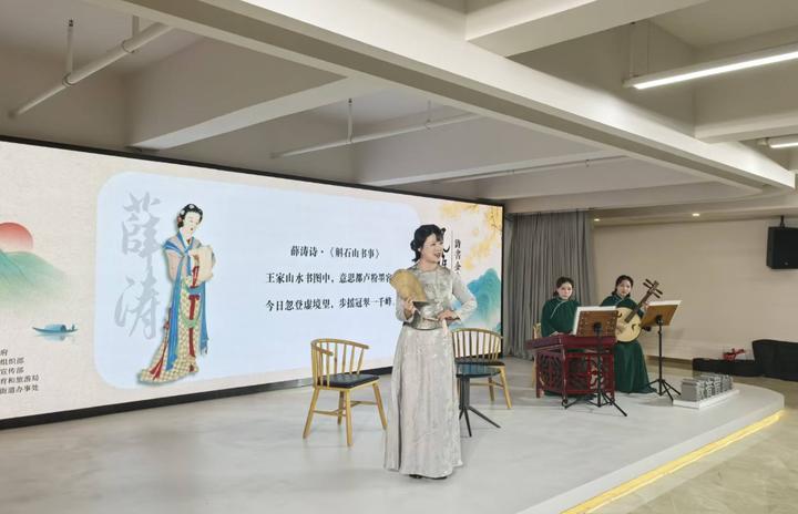 本次活动阵容汇聚了多位在诗歌、曲艺、音乐等领域的代表性人物,旨在打造一个多元艺术形式深度对话、交融生发的诗意场域。活动由一曲空灵悠远的《九天开出一成都》拉开序幕,演唱者黄天信作为央视“经典永流传”的经典传唱人,其歌声率先为现场注入古韵今声的独特气质。首位分享嘉宾——四川扬琴省级代表性传承人、国家一级演员吴瑕以《曲艺里的诗文风骨》为题,从国家级非遗“四川扬琴”的艺术视角,娓娓道来扬琴唱词与古典诗文同根同源的美学联系。并通过一首《锦城芙蓉吟》的经典选段,用婉转的唱腔和细腻的表演让沉睡于文字中的诗词“活”了起来。