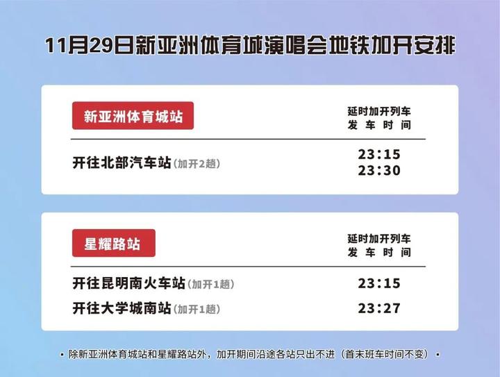除新亚洲体育城站和星耀路站外,加开期间沿途各站只出不进(首末班车时间不变)。
