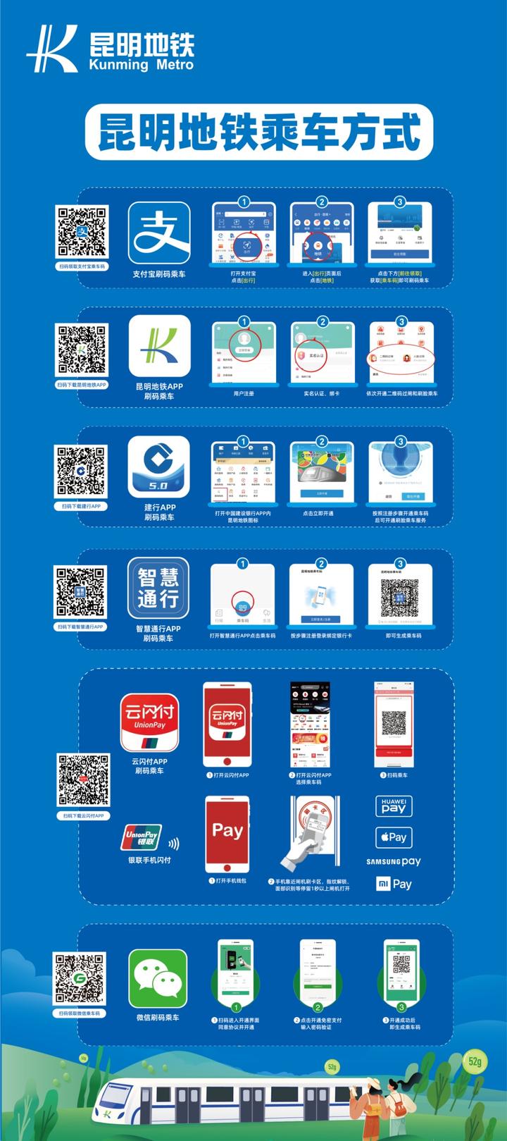 乘客可选择购买单程票、计次票、储值卡等实体票卡,也可在进站前准备好昆明地铁 APP、云闪付 APP、微信乘车码、支付宝乘车码等手机支付方式,还能使用刷脸乘车,以提高通行效率。(温馨提示:昆明地铁已在支付宝上线“同行票”,该功能适用于结伴出行乘客,一人刷码,多人过闸。)