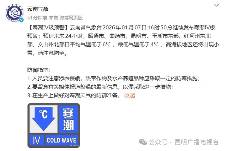 受冷空气影响,预计1月5日夜间至8日,昆明将出现强降温弱雨(雪)天气过程,最高气温下降6~8℃,局地下降超过10℃;过程期间,将出现持续低温阴冷天气,东部、北部高海拔山区有雨夹雪或小雪,需提前采取防寒防冻措施。