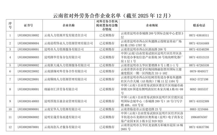 截至2025年12月,云南省取得对外劳务合作企业经营资格的企业共12家,现公布如下。