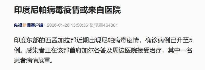 据央视新闻最新消息,印度东部的西孟加拉邦近期出现尼帕病毒疫情,确诊病例已升至5例。感染者正在该邦首府加尔各答及周边医院接受治疗,其中一名患者病情危重。