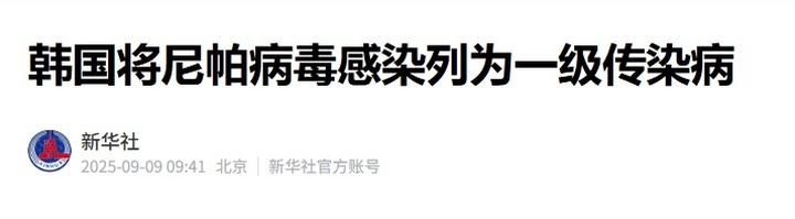 在2025年9月,韩国疾病管理厅已宣布将尼帕病毒感染列为一级传染病,系五年来首次增列。