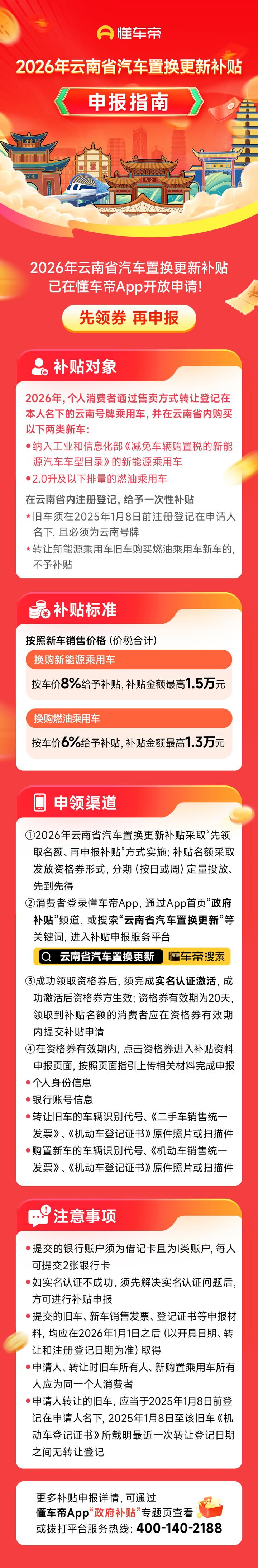 需要注意的是:申请人、转让时旧车所有人、新购置乘用车所有人应为同一个人消费者。申请人转让的旧车,应当在2025年1月8日前登记在申请人名下,2025年1月8日至该旧车《机动车登记证书》所载明最近一次转让登记日期之间无转让登记。旧车、新车的销售发票、登记证书材料,均应在2026年1月1日后取得。更多补贴申报详情,可通过“云南省商务厅”微信公众号,或懂车帝App“政府补贴”频道进行查看。
