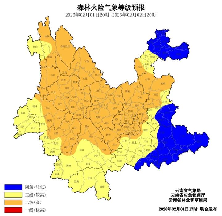 2026年2月1日20时至2026年2月2日20时,怒江州中部和南部、迪庆州、丽江市、大理州、保山市东部、临沧市北部、普洱市北部、楚雄州、昆明市、玉溪市、昭通市西南部、曲靖市北部二级,怒江州北部、德宏州、保山市西部、临沧市南部、普洱市南部、西双版纳州、红河州北部和中部、昭通市中部、曲靖市中部三级,其他地区四级。