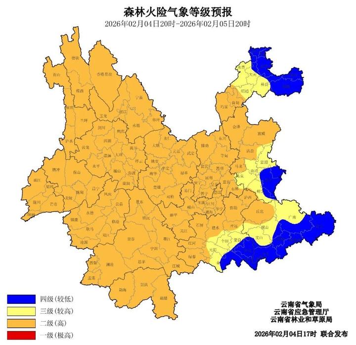 2026年2月4日20时至2026年2月5日20时,怒江州、迪庆州、丽江市、大理州、保山市、德宏州、临沧市、普洱市、西双版纳州、楚雄州、昆明市、玉溪市、红河州西部北部、文山州西北部、昭通市南部、曲靖市北部二级,红河州东南部、文山州中部、曲靖市中南部、昭通市中部三级,其他地区四级。