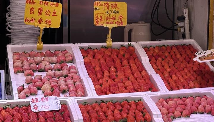 草莓摊位同样人气爆棚,堪称水果区的“颜值担当”。粉色、白色、深红色的果实错落摆放,红颜、白雪公主、粉玉等多个品种一应俱全。价格方面,最实惠的观音山草莓每公斤仅15元起,而红颜、粉玉等精品草莓价格则在每公斤50至100元不等,能满足不同消费者的选购需求。