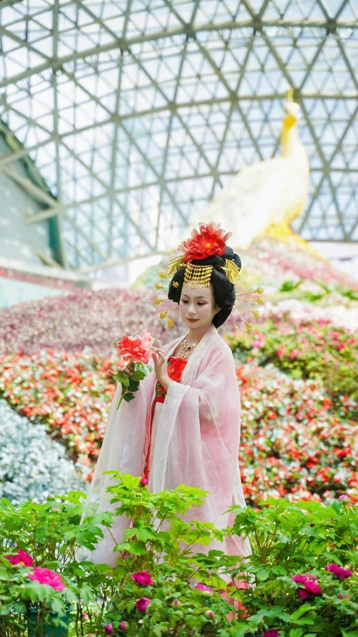 为了让体验更丰富,花展还设有多样互动活动。游客可前往汉服换装区,体验专业妆造后身着传统服饰漫步花海,沉浸式感受“穿越盛唐”的乐趣。