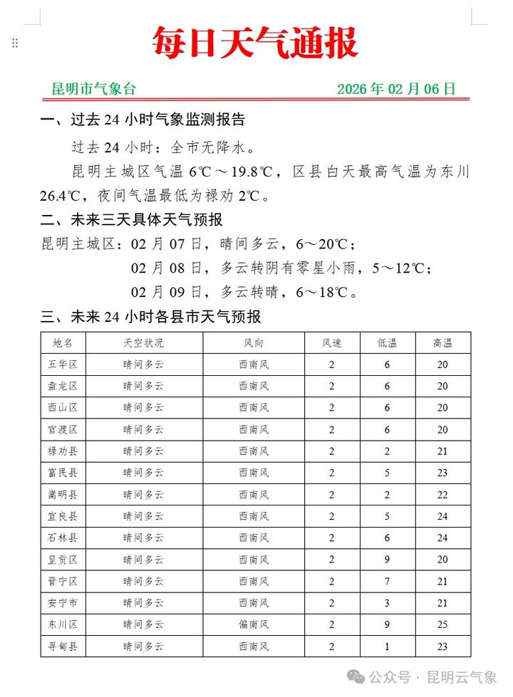 2月6日20时到2月7日20时:昭通市北部、曲靖市东部、文山州东部和南部、红河州东南部多云间阴局地有分散小雨,其他地区晴间多云。