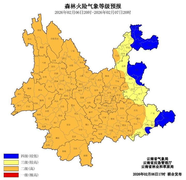 2026年2月6日20时至2026年2月7日20时,怒江州、迪庆州、丽江市、大理州、保山市、德宏州、临沧市、普洱市、西双版纳州、楚雄州、昆明市、玉溪市、红河州、文山州西部、昭通市西南部、曲靖市西部边缘二级,文山州中部、曲靖市中部、昭通市中部三级,其他地区四级。
