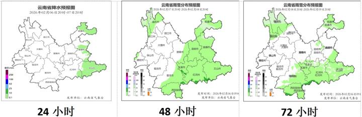2月7日20时到2月8日20时:迪庆州北部、怒江州北部、昭通市、曲靖市北部的高海拔地区阴有小雪或雨夹雪,曲靖市南部、昆明市、楚雄州东部、玉溪市、文山州、红河州、普洱市东部、西双版纳州多云转阴有小雨局部中雨,其他地区多云间晴。