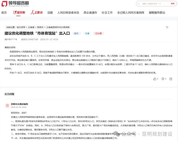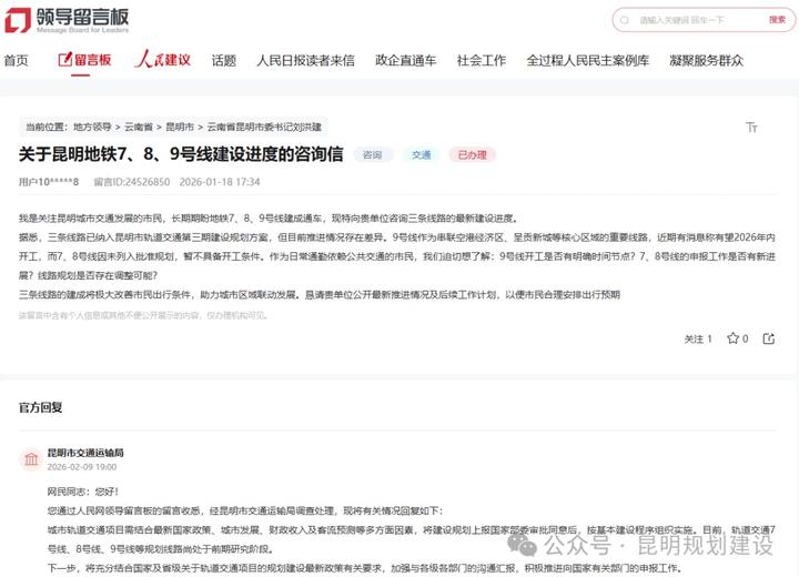 近日,针对网友在人民网领导留言板上关于“昆明地铁7、8、9号线建设进度”及“建议优化调整市体育馆站出入口”的留言,昆明市交通运输局分别进行了回复。