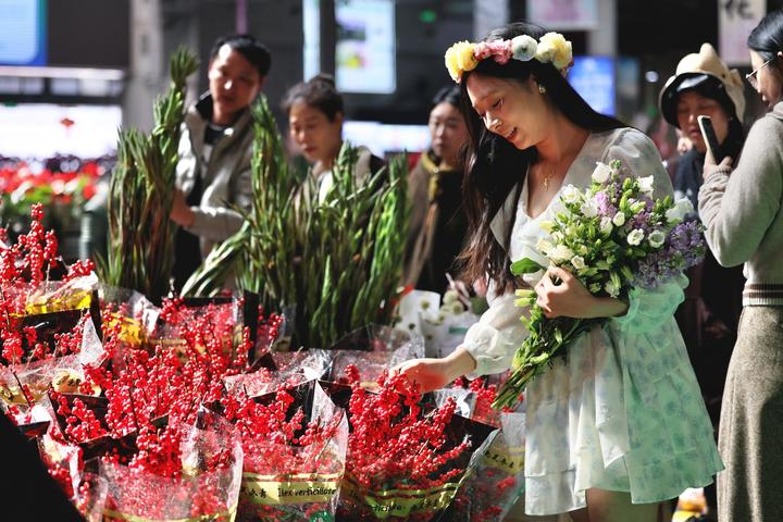 “双节”叠加,今年的斗南花卉市场格外火爆。不仅本地市民购花热情高涨,许多来云南过年的外地游客也纷纷加入“赶花集”的行列。一位来自浙江嘉兴的游客今年第一次带家人来云南过年,她早就听闻云南鲜花物美价廉,特意前来打卡采购。她说:“既能买百合、银柳装点民宿迎春节,又能买玫瑰庆祝情人节,一举两得。在鲜花里过年,感觉特别浪漫。”她还表示,带着鲜花回家,既是送给家人的新春礼物,也是旅途中最美好的纪念。